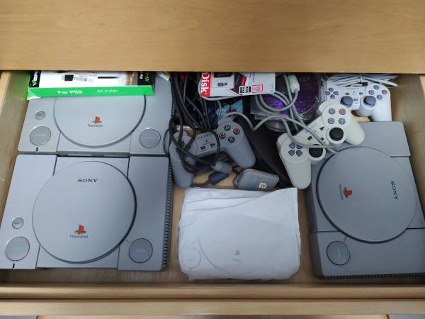 I'm lazy, and I honestly hate battling my computer just to get stuff done. So I went the easy way here. I'm using VS Code with the PSX.Dev extension by Grumpycoders. It comes with most of the necessary tools (compilers, a debugging-capable emulator, linker, etc.) to generate a PlayStation program, plus the tools from the Sony PsyQ SDK. The alternative would be using an old computer running Windows 95/98 or emulating it in some kind of virtual machine setup, which comes with all kinds of limitations on file sharing, internet access (for Git), and so on. Also, the original solution uses an older compiler, which isn’t as good as the one used by PSX.Dev. Sure, it would make it easier to work with Sony tools made for Windows 95, but most of them still work on Windows 10, and for the few that don’t, I use DOSBox. My setup is a desktop running Ubuntu (again, lazy...) and a notebook with Windows 10. I don’t use Copilot, not because I think I can do better (I’m a pretty bad programmer), but because, like with my comics, I like to use my own brain. It’s all I have, all I am... I don’t want it to waste away. I’ll probably have to use Copilot (or something like it) at my job soon just to keep up, but for my hobbies, I prefer doing things myself. Back to the dev setup... most of the tool usage happens on the notebook, for no real reason other than I haven’t configured Wine to run everything on the Linux machine. On the PSX hardware front, I have four. A real collector would probably laugh at me, but it’s enough to raise eyebrows from regular folks :D Each one has a different bypass to allow it to run homemade ISOs. Here is my happy drawer: